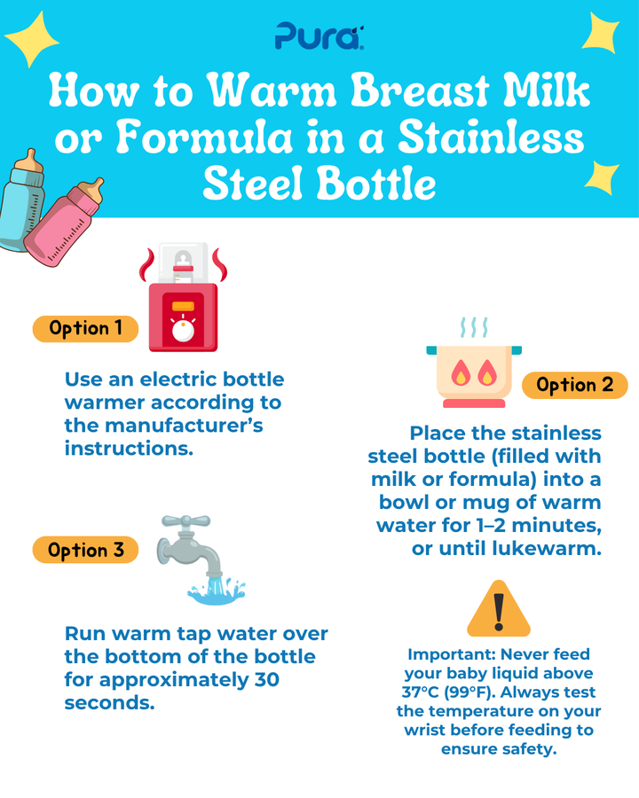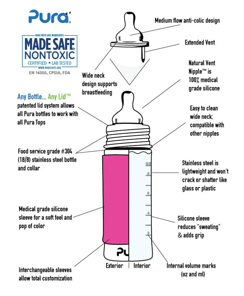 • Zero Plastic… Zero Yuck™: Bottle and collar crafted from safe, anti-bacterial, #304 stainless steel and Pura Anti-Colic Natural Vent Teat™ crafted from 100% medical grade silicone