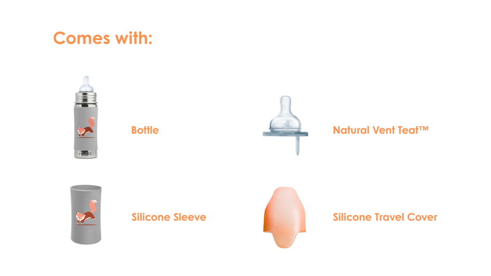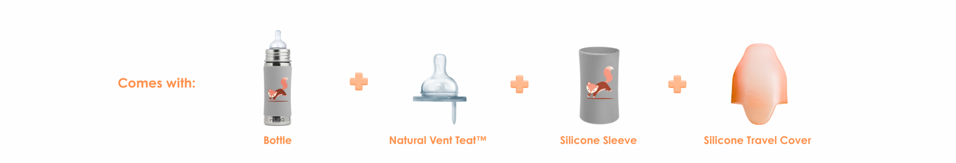 Stainless steel bottle with medical grade silicone Medium Flow Natural Vent Teat™, Fox silicone sleeve, and travel cover.