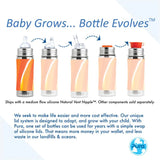 • Baby Grows...Bottle Evolves™: This bottle easily converts into a sippy bottle, straw bottle, or sport/water bottle by simply swapping the teat out for another Pura Silicone Lids.