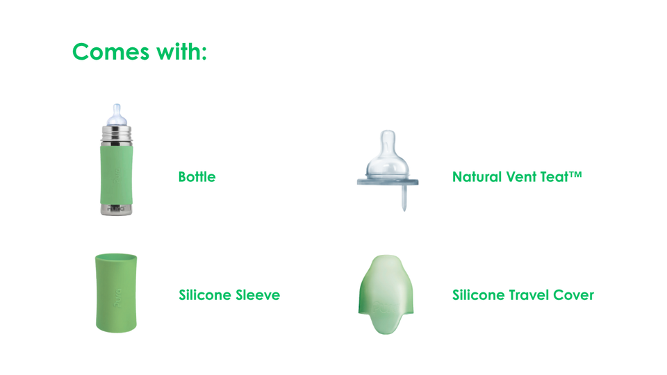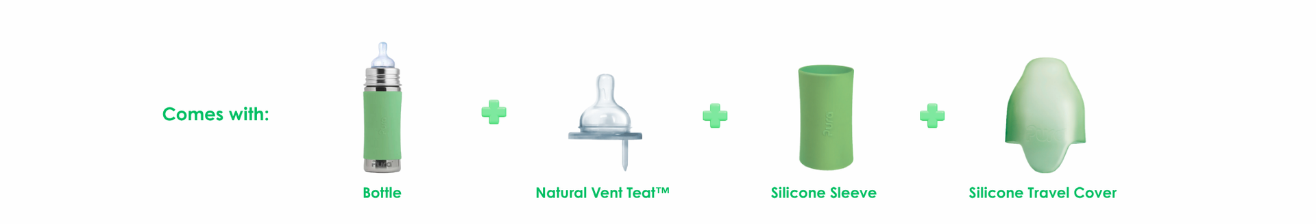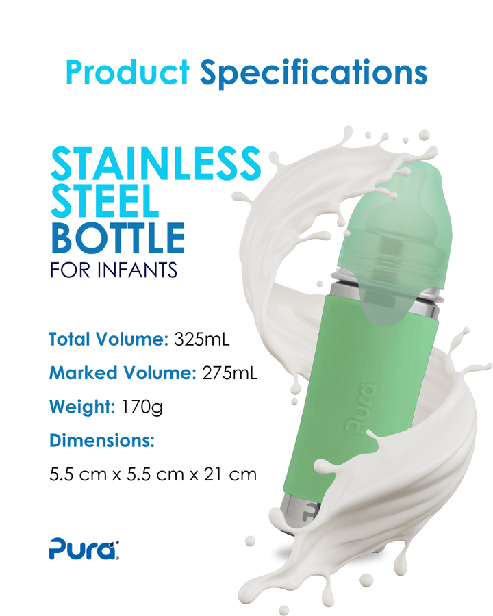 - Zero Plastic… Zero Yuck™: Bottle and collar crafted from safe, anti-bacterial, #304 stainless steel and Pura Anti-Colic Natural Vent Teat™ crafted from 100% medical grade silicone